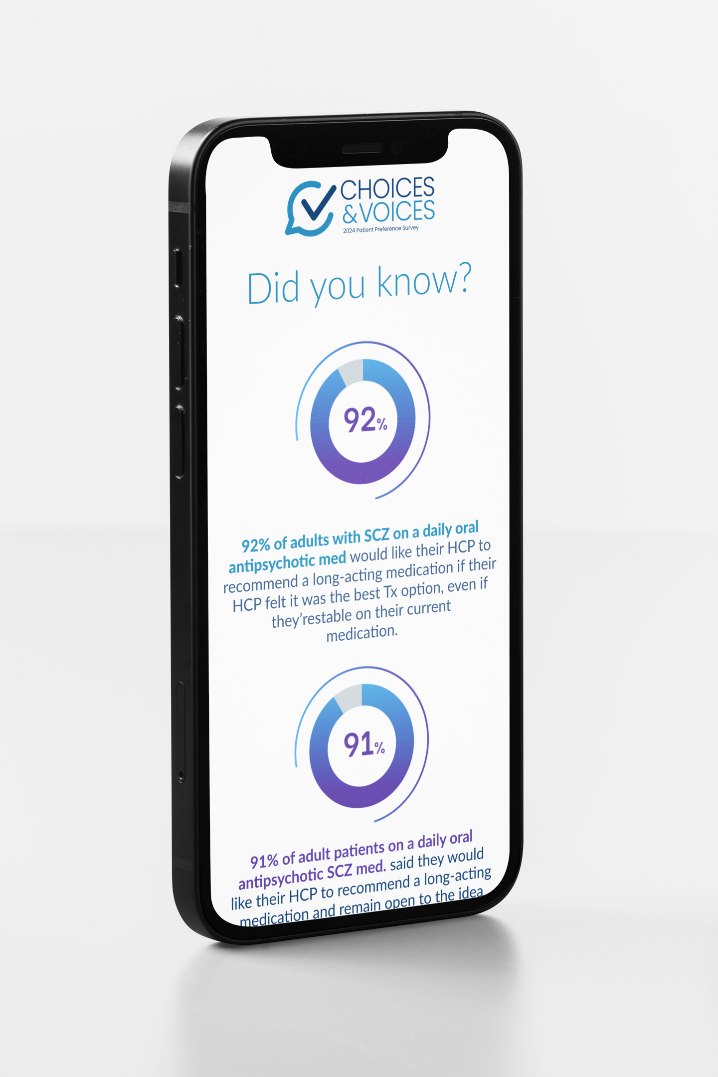 To gain real-world insight into what schizophrenia patients want in their treatment plans, we decided to ask them. I leveraged the survey results as a complimentary, unbranded method of promoting Long-Acting Injectables (LAIs) as the preferred treatment choice. I elevated the survey by branding it with an official name, logo, and visual identity that would ultimately be used in combination with approved branded content.