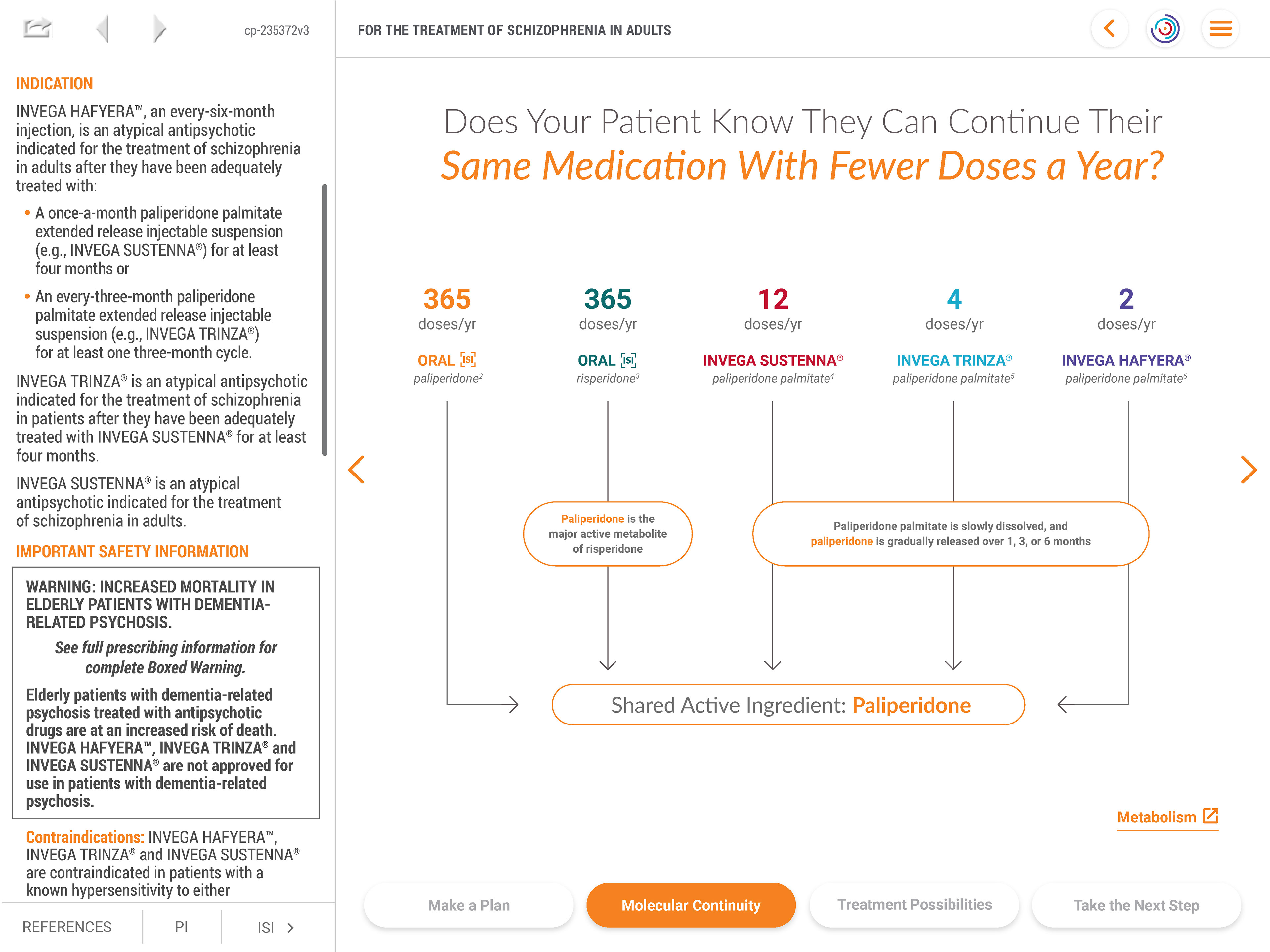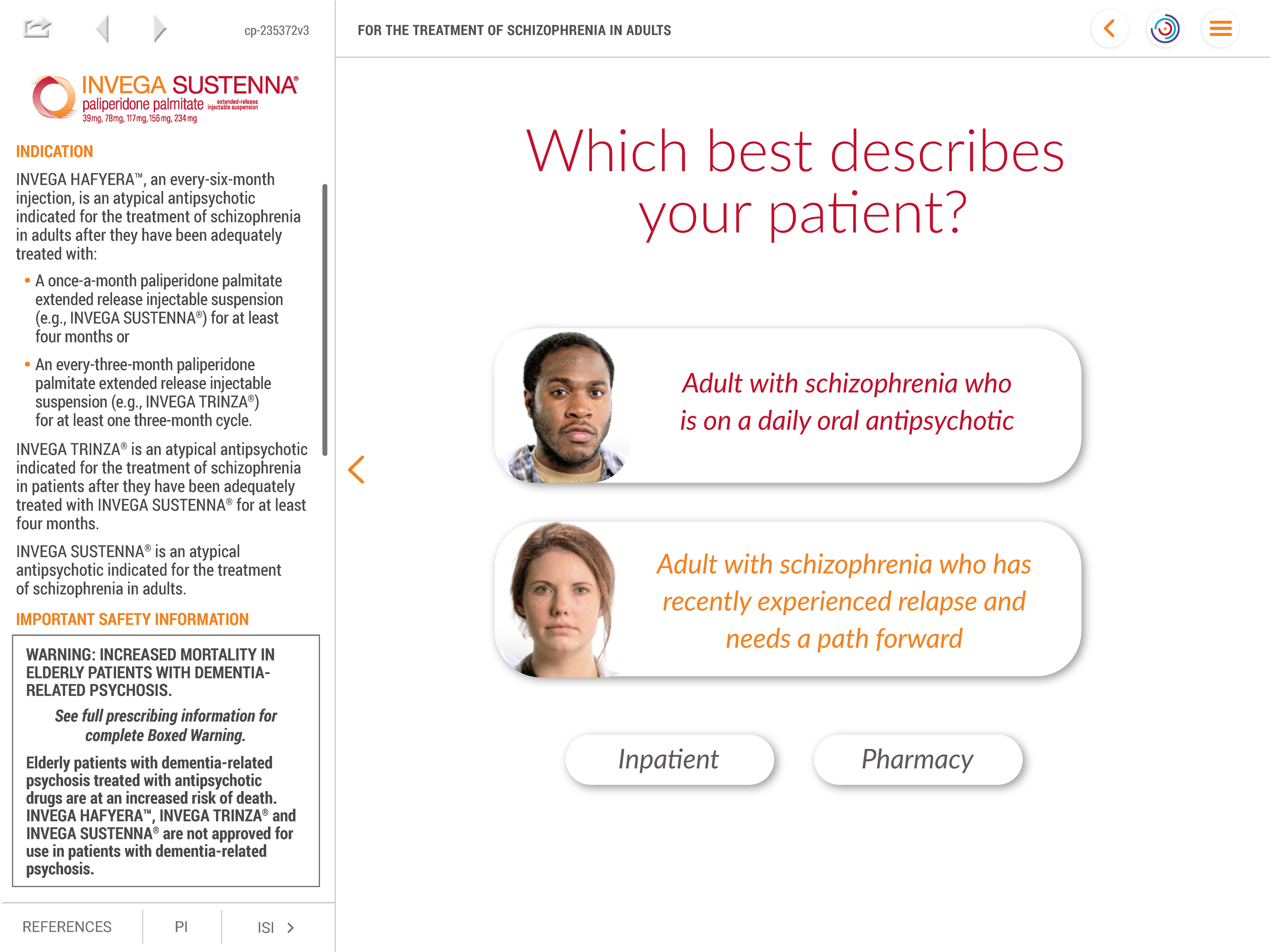 I designed the INVEGA® PATHWAY IVA as an intuitive tool to provide our sales force with an interactive, data-driven experience, allowing users to explore the benefits, efficacy, and administration of INVEGA® LAIs through data visualizations, clinical study summaries, and patient case studies. Equipped with real-time customization, it tailors presentations based on specific provider needs, ensuring a seamless and informative discussion. The IVA also integrates compliance-approved messaging and decision-support tools to facilitate informed prescribing decisions, ultimately improving patient outcomes.